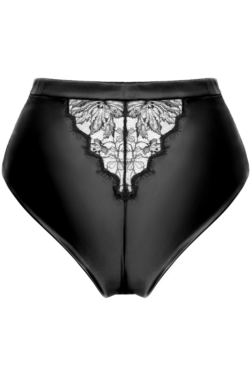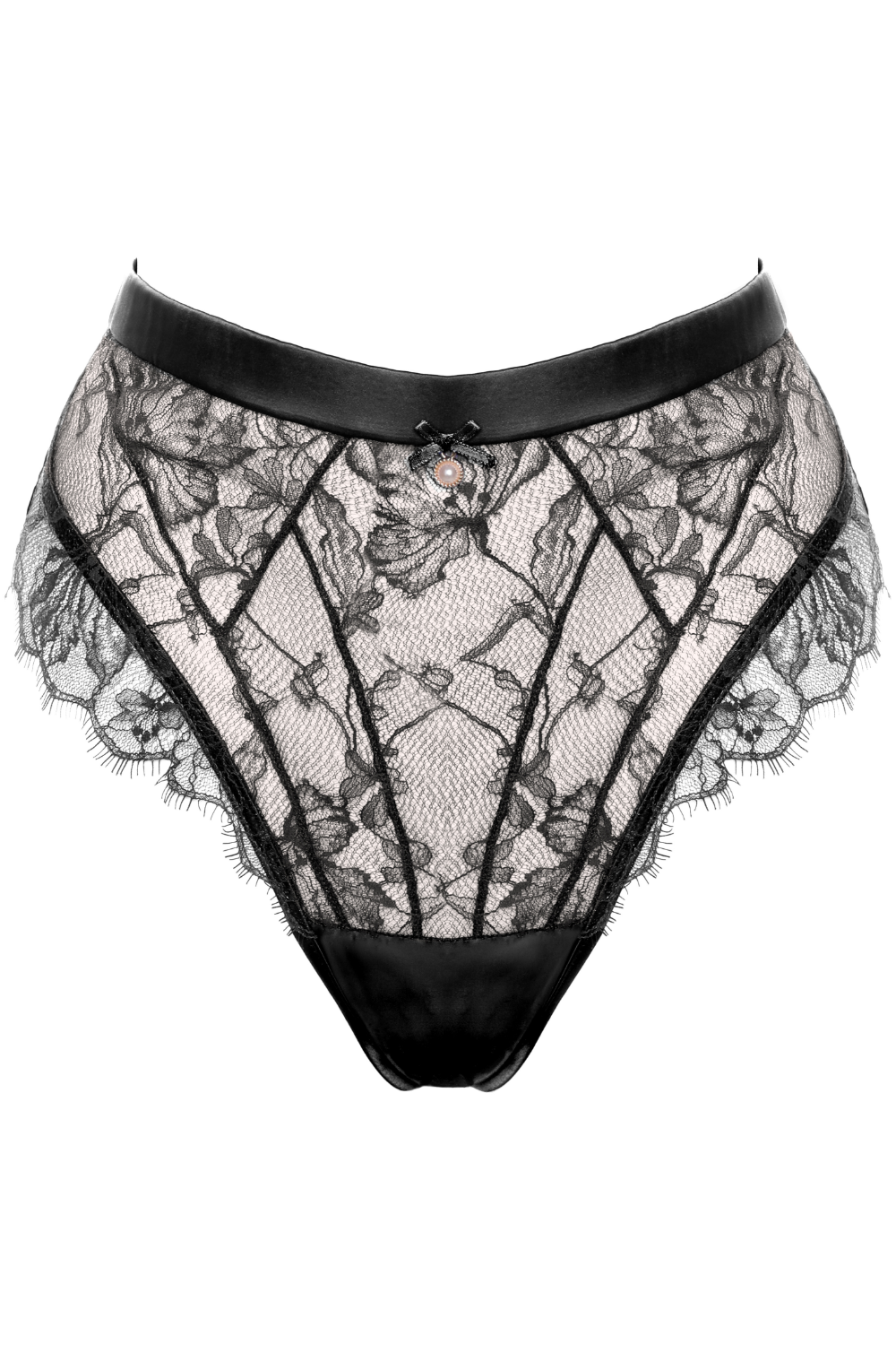 Black Pearl High Waist Brief in Italian floral lace with eyelash trim and satin back. Luxurious, elegant, and designed for comfort and timeless sophistication.