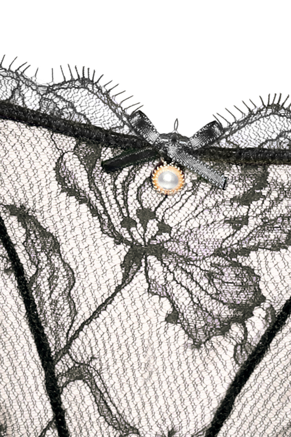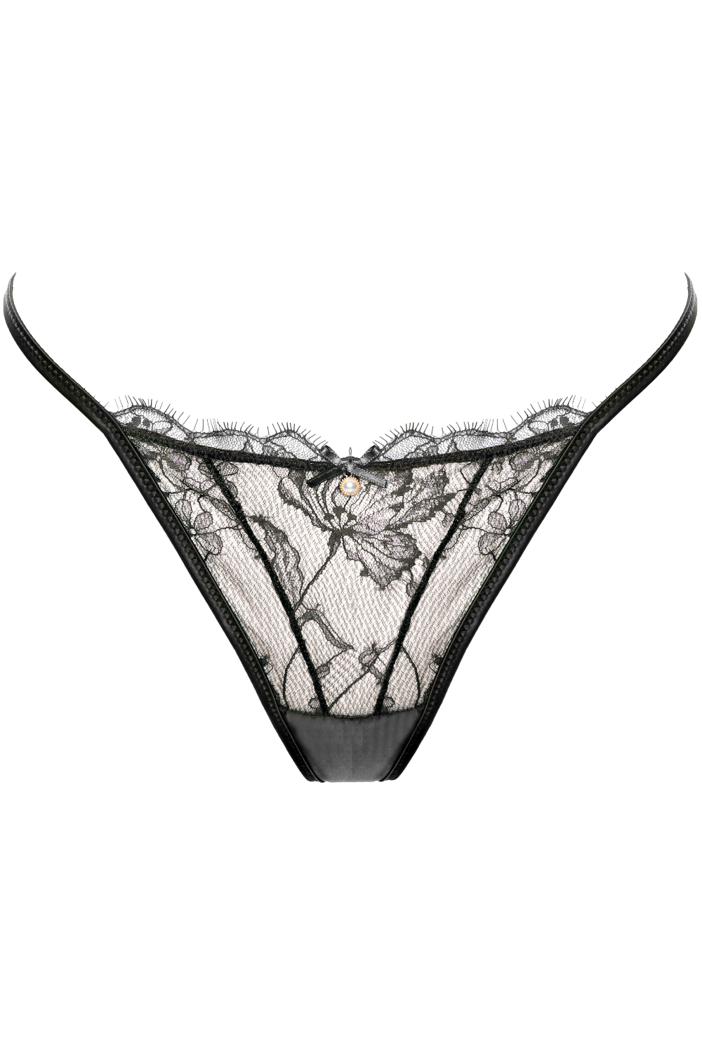 Black Pearl Mini Thong in Italian floral lace with eyelash trim, satin, and thin straps. Luxurious, comfortable, and artfully crafted for a refined look.