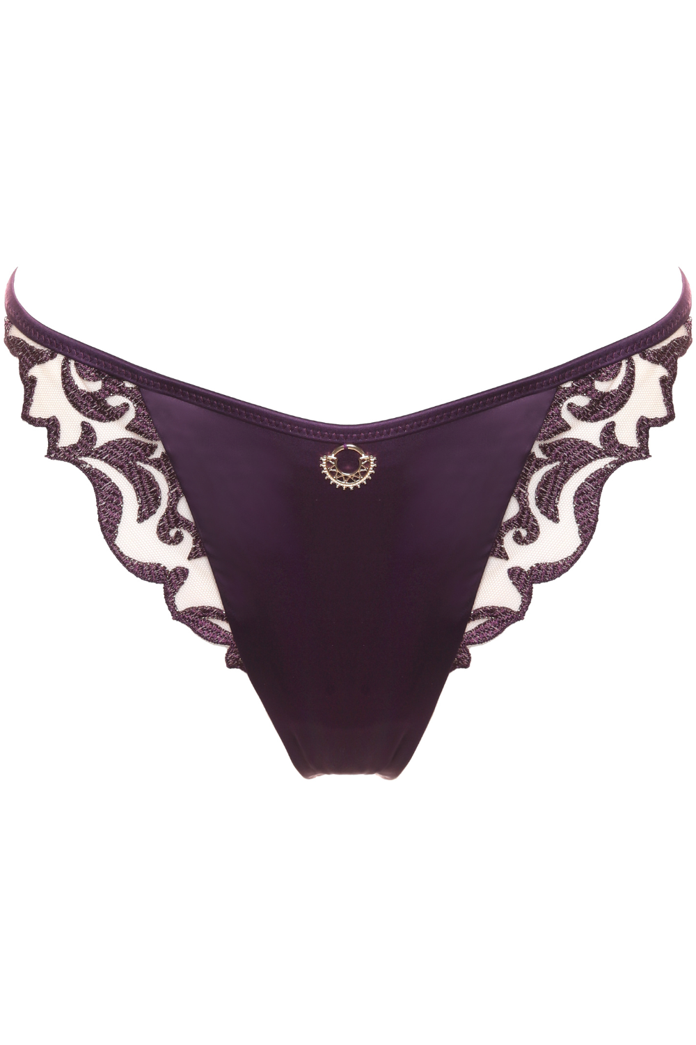 The Venus Brief in violet pairs intricate embroidered mesh with a satin front and trims. Flattering brief cut and cotton gusset ensure comfort and sophistication, making it a refined and sensual lingerie essential.