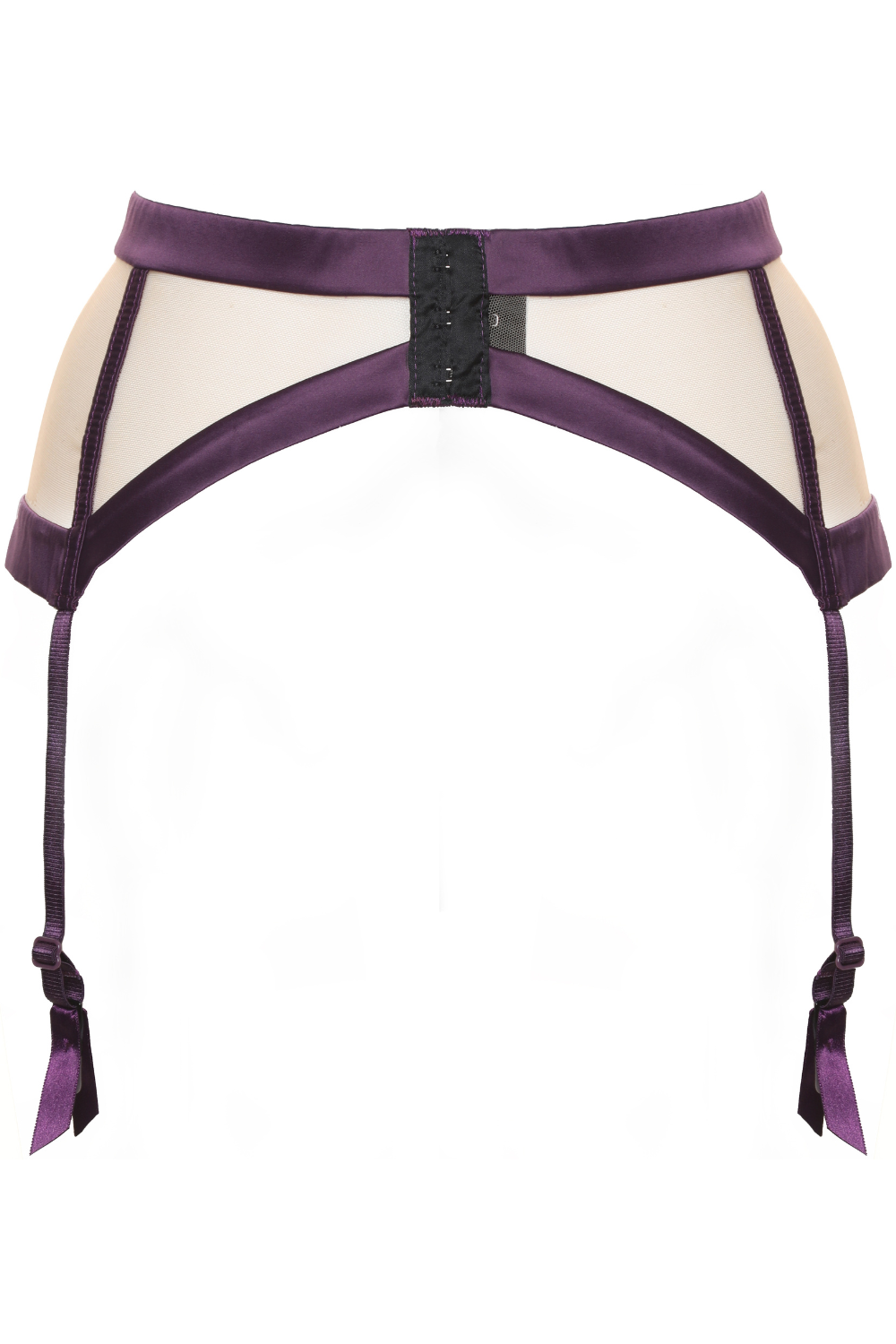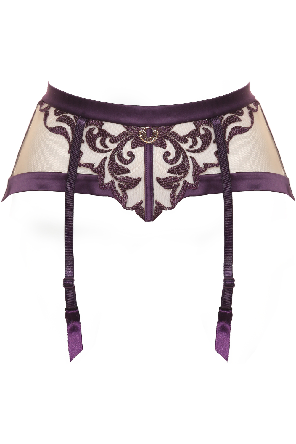The Venus Suspender Belt in violet pairs intricate embroidered mesh with soft satin trims for a romantic, sculpting silhouette. Four adjustable garter straps and a hook-and-eye back closure offer comfort, structure and timeless goddess-like allure.